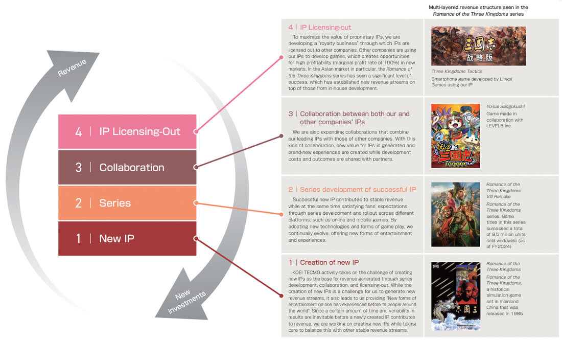 KOEI TECMO achieves sustainable growth through a "multi-layered revenue structure". By (1) Creation of new global IPs, (2) Series development of successful IP, (3) Collaboration between both our and other companies' IPs, and (4) IP Licensing-out, we have achieved sustainable, stable, and highly profitable growth in the competitive game industry.