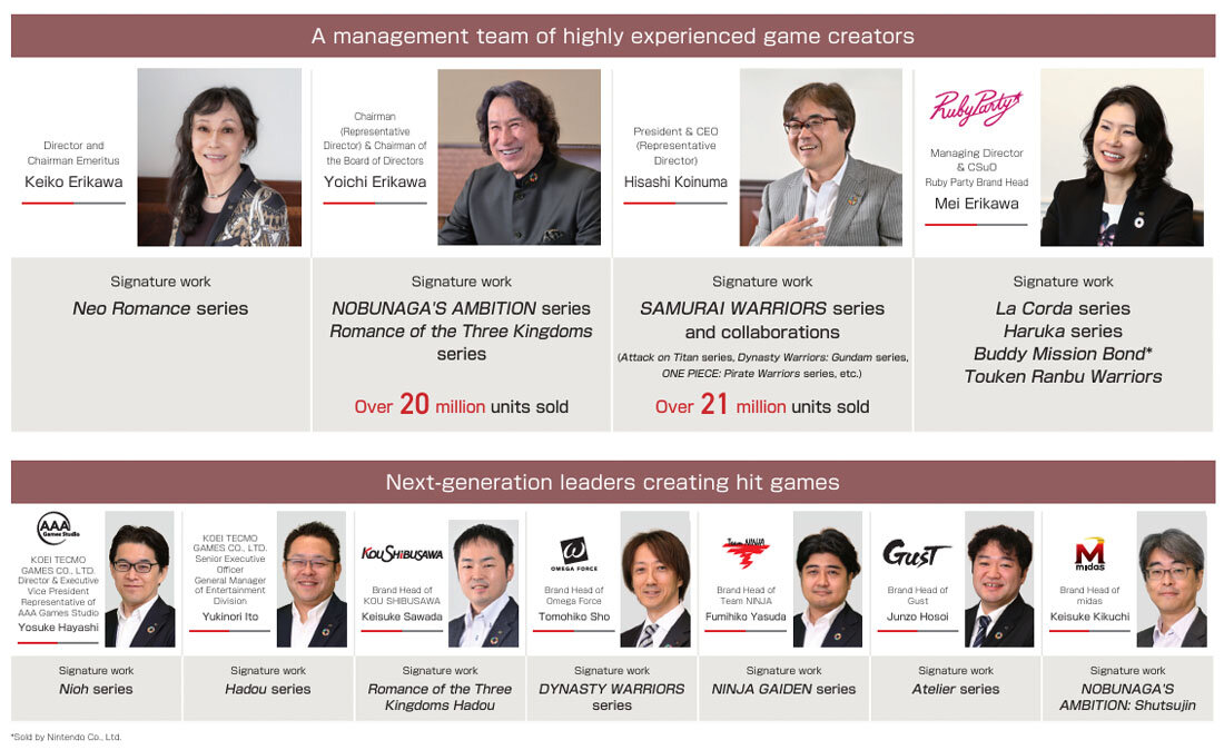 Our incredible teams have both the creativity to build new worlds and the business acumen to drive projects towards success. They form the bedrock of the KOEI TECMO Group's high profitability and sustained growth. Our highly-experienced management team and brand heads have built a culture where all employees consider every part of a project, from the planning stage to the profit review stage, all while delivering high-quality projects on time and under budget. In our rapidly-changing industry, our dual-skilled team culture is what makes the KOEI TECMO Group such a strong competitor.